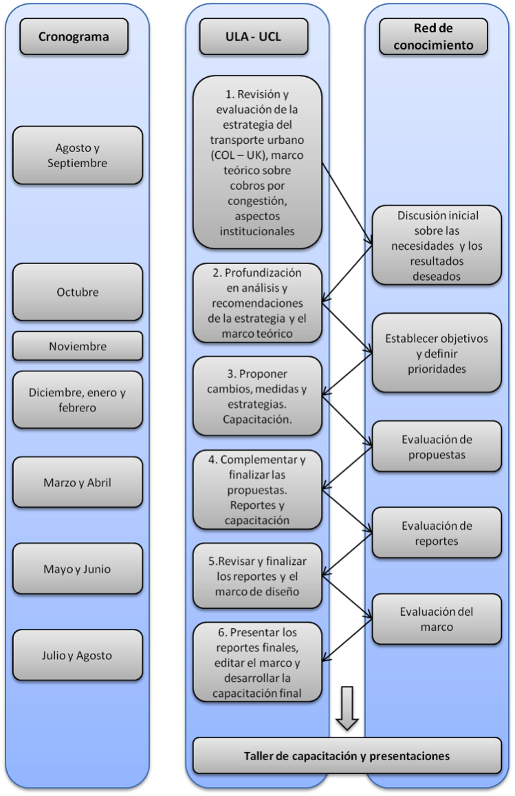 La red de conocimiento interinstitucional tiene como principal objetivo revisar y evaluar las propuestas y reportes hechos por los equipos UCL y Uniandes como se muestra en la siguiente figura. El equipo conformado por expertos tendrá al menos 5 reuniones durante el desarrollo del proyecto en las que se pretende aprovechar su experiencia en las diferentes instituciones para alimentar las diferentes etapas del proyecto. Finalmente, la red hará parte del taller de capacitación que se realizará al final del proyecto.